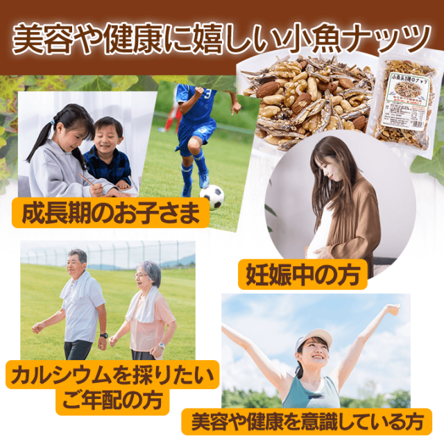 落花生(中国産)、くるみ、煮干し(国内産)、アーモンド(アメリカ産)、植物性油脂、砂糖、ごま、しょうゆ、澱粉分解物、食塩/調味料(アミノ酸等)、酸化防止剤(ビタミンE)(一部に小麦粉・大豆・ごまを含む) |